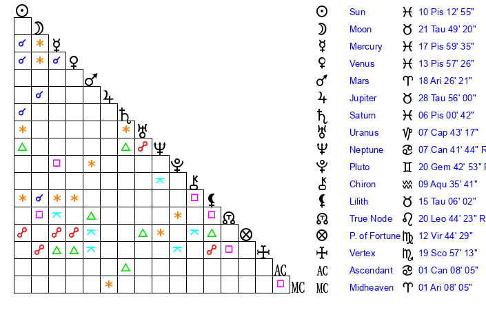| Sun | 10 Pisces 13 | 11 Pisces 22 | 6 Cancer 3 |