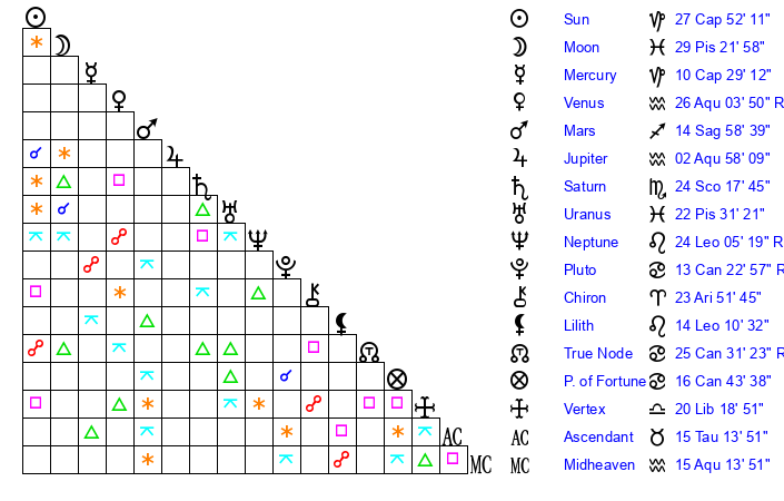 | Saturn | 24 Scorpio 46 | 15 Pisces 59 | 24 Scorpio 32 |