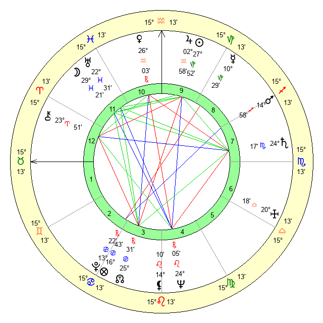 | Moon | 29 Pisces 16 | 24 Virgo 40 | 3 Scorpio 6 |