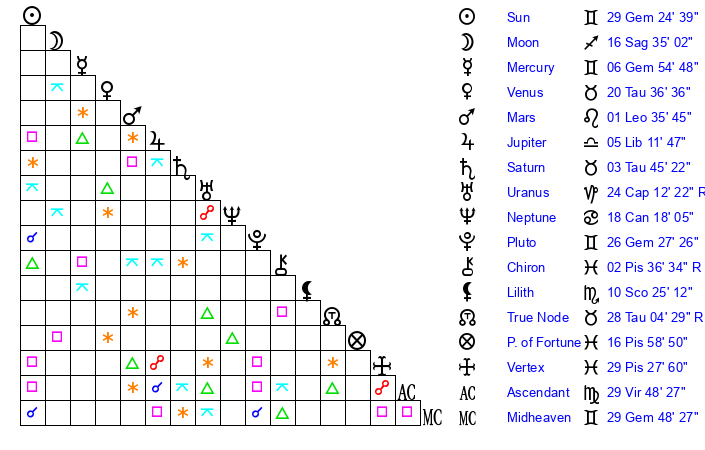 | Pluto | 26 Gemini 27 | 3 Aquarius 19 | 27 Gemini 54 |