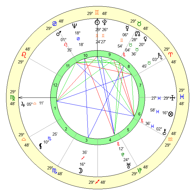 | Sun | 29 Gemini 25 | 0 Cancer 34 | 20 Libra 28 |