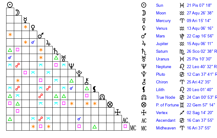 | Moon | 27 Aquarius 39 | 1 Virgo 28 | 8 Libra 17 |