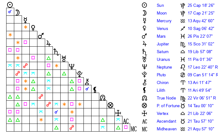 Mercury | 13 Aquarius 43 | 11 Capricorn 46 | 26 Taurus 6 |