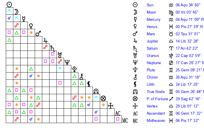 | Saturn | 18 Aries 14 | 16 Pisces 52 | 1 Taurus 6 |