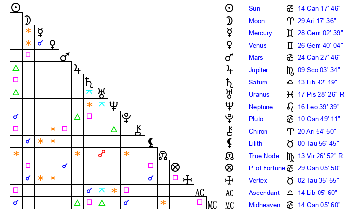 Moon | 29 Aries 14 | 6 Sagittarius 27 | 0 Aquarius 19 |