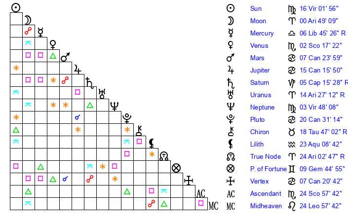 | Moon | 0 Aries 56 | 9 Aries 46 | 28 Virgo 41 |