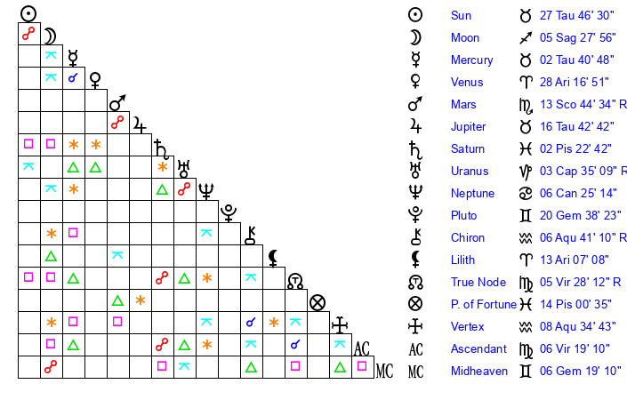 | Sun | 27 Taurus 47 | 28 Taurus 43 | 22 Virgo 54 |