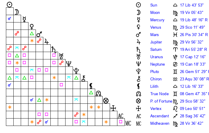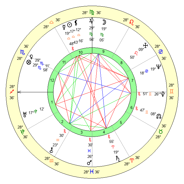 | Moon | 19 Virgo 5 | 21 Gemini 40 | 9 Sagittarius 29 |