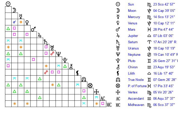 | Sun | 23 Scorpio 43 | 24 Scorpio 50 | 20 Pisces 15 |