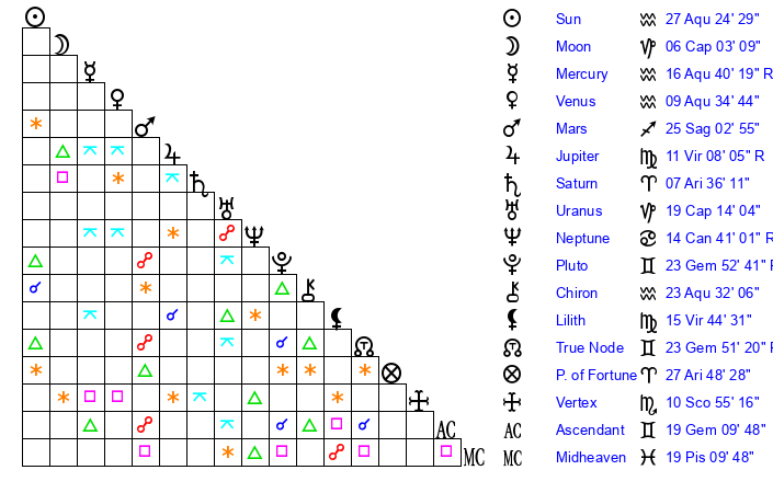 | Sun | 27 Aquarius 25 | 28 Aquarius 16 | 21 Gemini 3 |