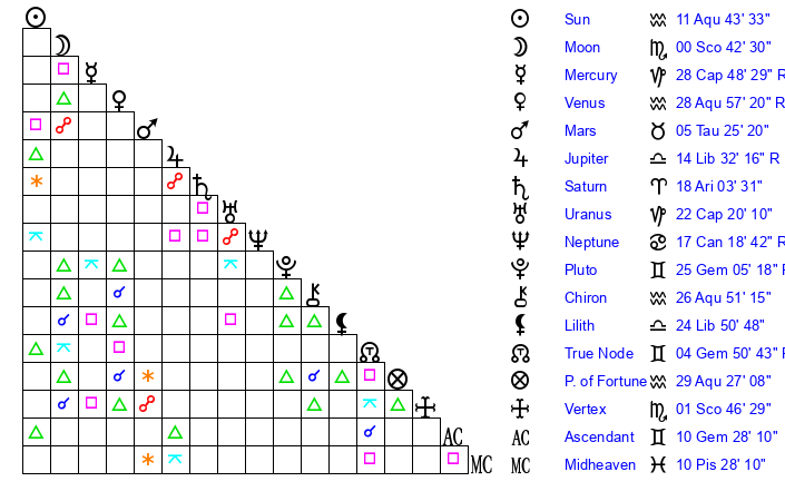 | Sun | 11 Aquarius 44 | 12 Aquarius 50 | 5 Gemini 16 |
