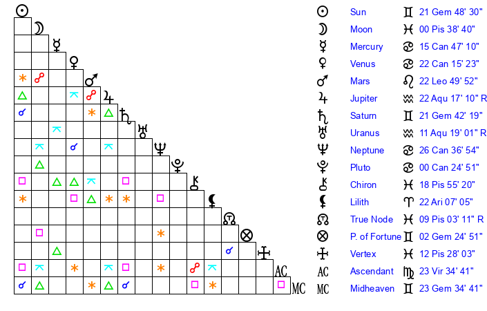| Moon | 0 Pisces 41 | 20 Capricorn 30 | 21 Pisces 33 |