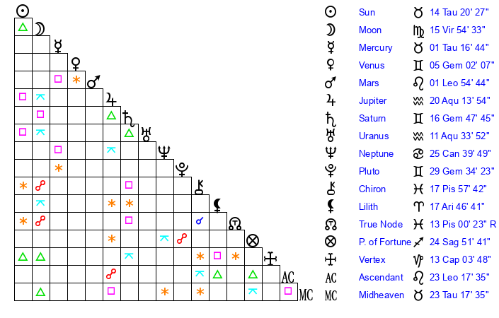 | Sun | 14 Taurus 20 | 15 Taurus 27 | 0 Virgo 39 |