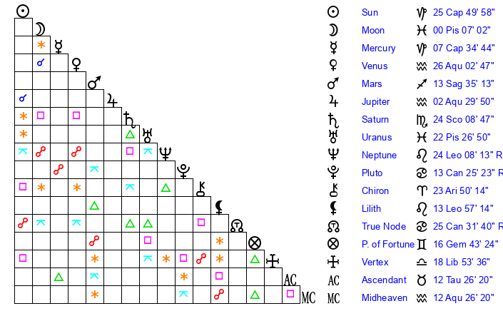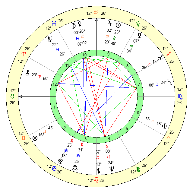 | Venus | 26 Aquarius 3 | 13 Pisces 50 | 18 Pisces 37 |