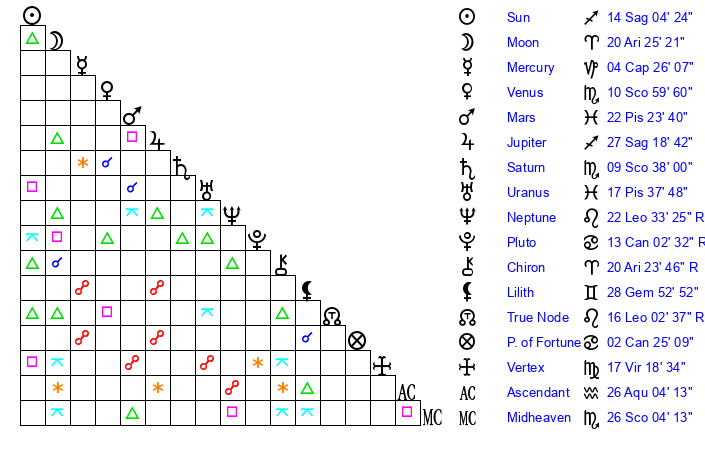 Moon | 20 Aries 24 | 17 Aquarius 4 | 8 Sagittarius 49 |