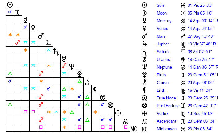 | Sun | 1 Pisces 27 | 2 Pisces 18 | 24 Gemini 52 |