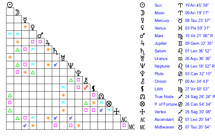 Sun | 19 Aries 46 | 20 Aries 50 | 2 Leo 37 |