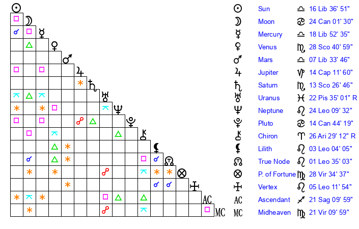 Sun | 16 Libra 37 | 17 Libra 24 | 27 Capricorn 37 |