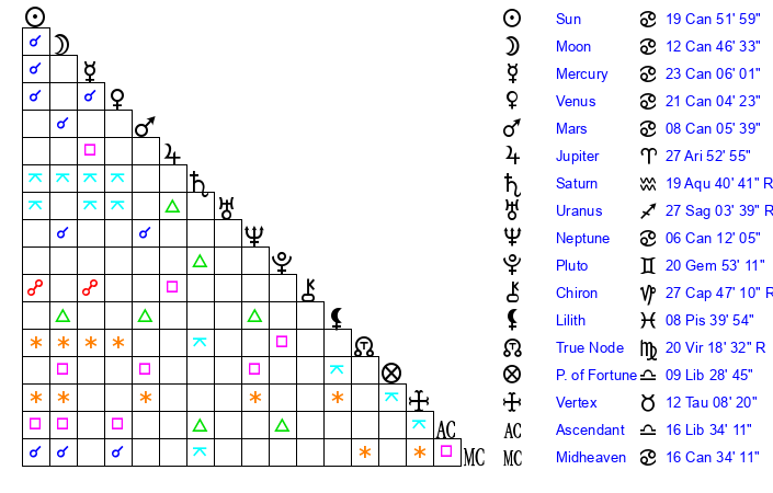 | Moon | 12 Cancer 43 | 12 Aquarius 59 | 27 Sagittarius 52 |