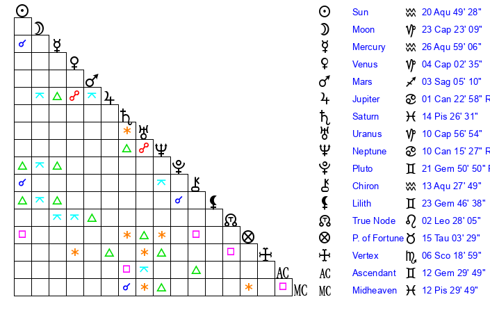 | Sun | 20 Aquarius 50 | 22 Aquarius 12 | 16 Gemini 44 |