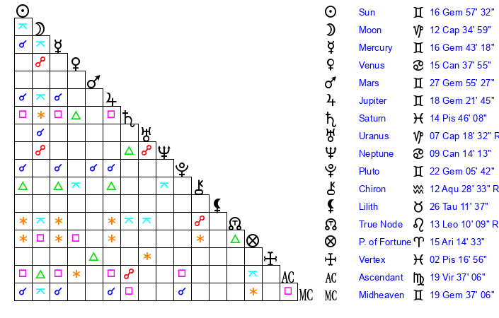 | Sun | 16 Gemini 58 | 18 Gemini 9 | 11 Libra 32 |