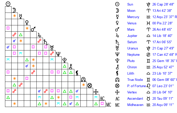 | Saturn | 17 Aries 39 | 15 Pisces 52 | 29 Aries 55 |