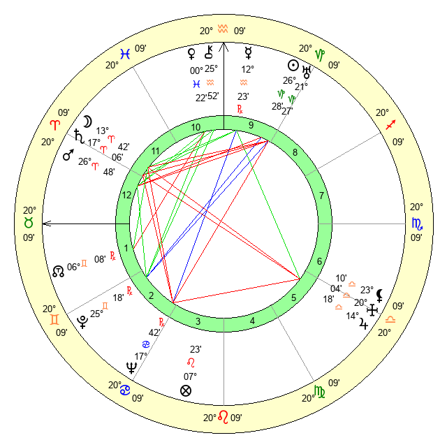 | Moon | 13 Aries 42 | 9 Virgo 25 | 5 Cancer 31 |