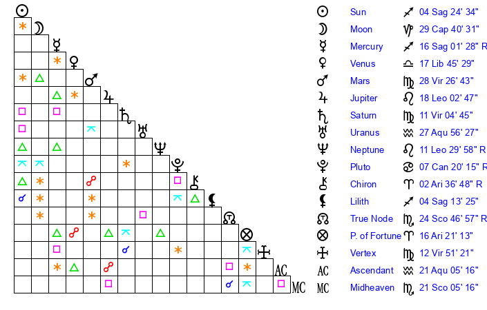 Saturn | 11 Virgo 46 | 12 Pisces 45 | 8 Virgo 4 |