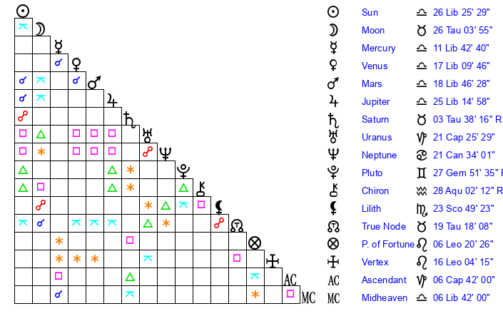 | Sun | 26 Libra 25 | 27 Libra 33 | 22 Aquarius 53 |