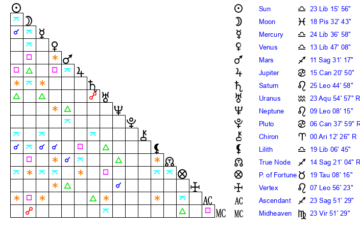 Sun | 23 Libra 15 | 24 Libra 20 | 11 Aquarius 33 |