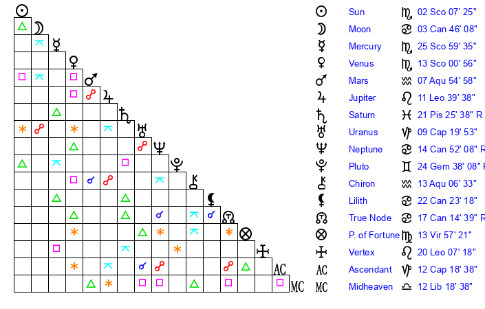 | Mercury | 26 Scorpio 0 | 27 Scorpio 2 | 14 Pisces 50 |