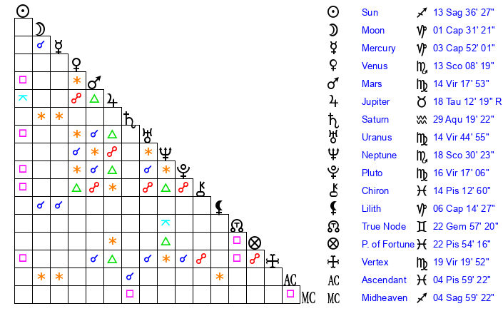 | Neptune | 18 Scorpio 30 | 27 Pisces 7 | 19 Scorpio 55 |