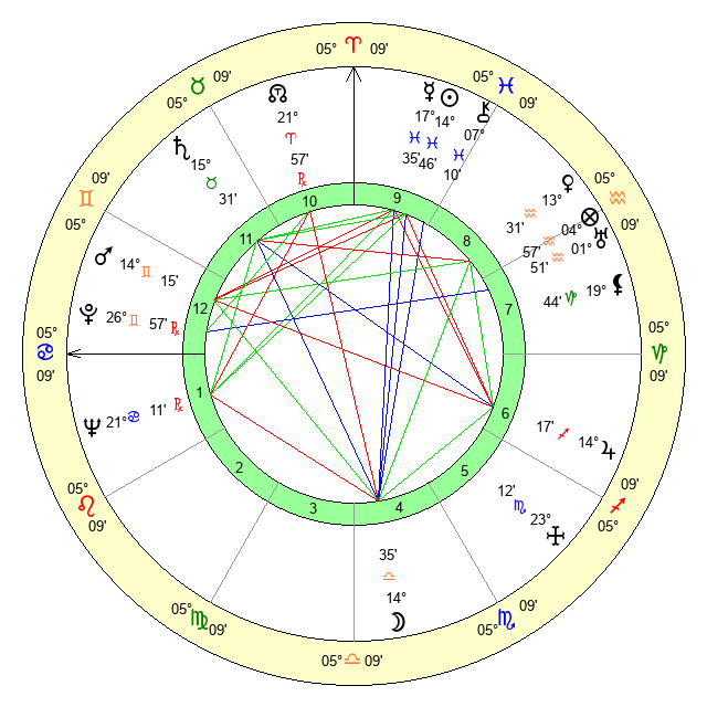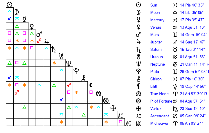 | Sun | 14 Pisces 46 | 15 Pisces 22 | 4 Cancer 40 |