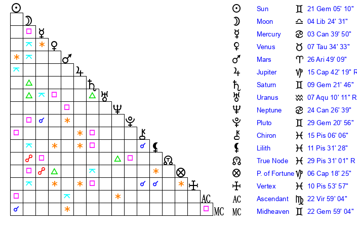 | Sun | 21 Gemini 5 | 21 Gemini 58 | 8 Libra 53 |