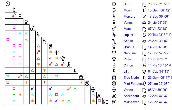 | Moon | 12 Gemini 53 | 3 Sagittarius 16 | 13 Virgo 53 |