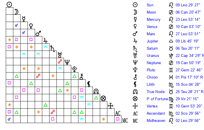 | Sun | 9 Leo 29 | 10 Leo 39 | 2 Sagittarius 34 |