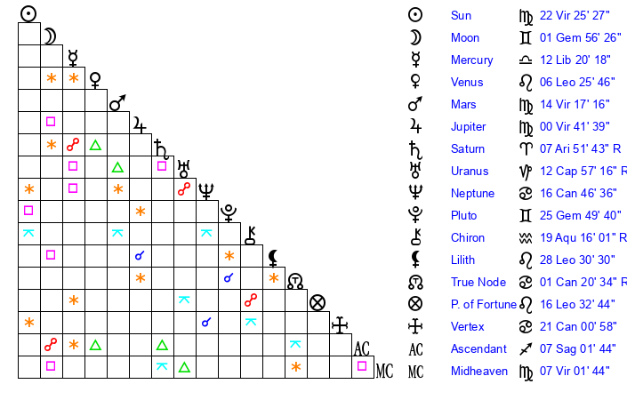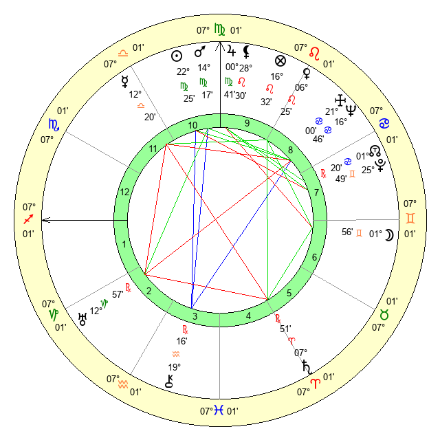 | Sun | 22 Virgo 26 | 23 Virgo 6 | 19 Capricorn 51 |