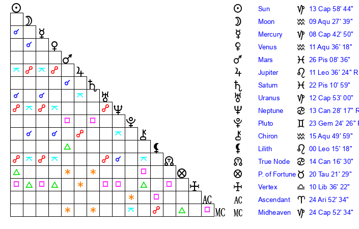| Venus | 11 Aquarius 37 | 2 Pisces 42 | 26 Gemini 19 |