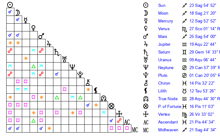 | Mercury | 12 Sagittarius 53 | 6 Sagittarius 27 | 21 Pisces 54 |
