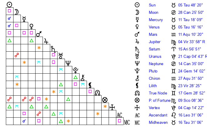 | Venus | 5 Taurus 17 | 27 Pisces 58 | 27 Virgo 13 |