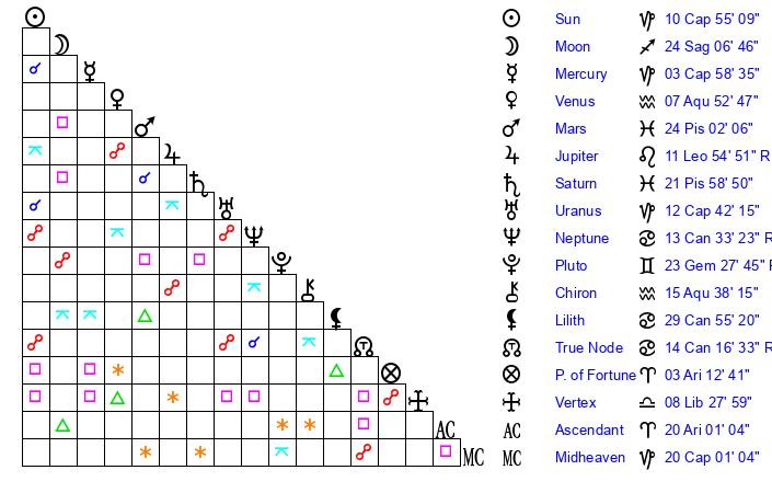 | Mercury | 3 Capricorn 59 | 22 Sagittarius 6 | 27 Aries 51 |