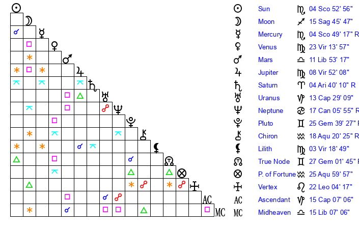 | Mercury | 4 Scorpio 49 | 29 Scorpio 13 | 13 Aquarius 24 |