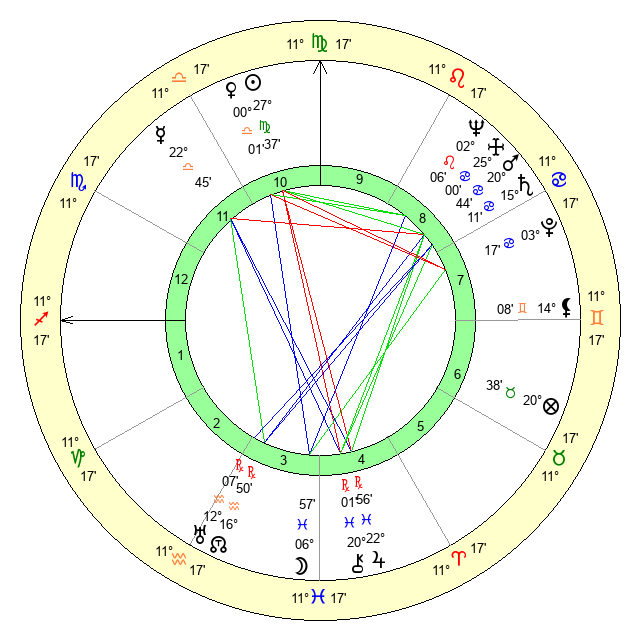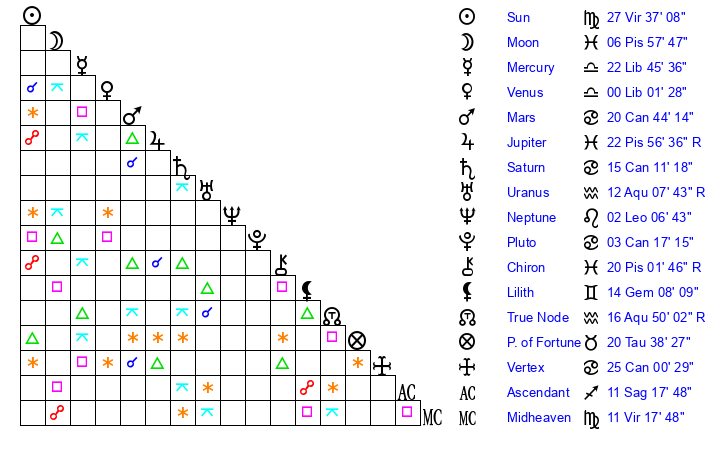 | Moon | 6 Pisces 52 | 27 Virgo 27 | 18 Pisces 47 |