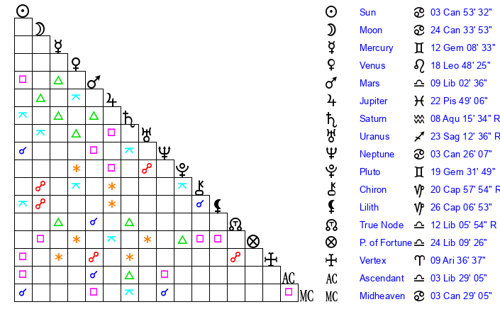 | Mercury | 12 Gemini 8 | 29 Cancer 53 | 16 Libra 23 |