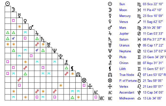 | Moon | 11 Pisces 45 | 12 Capricorn 8 | 12 Cancer 5 |