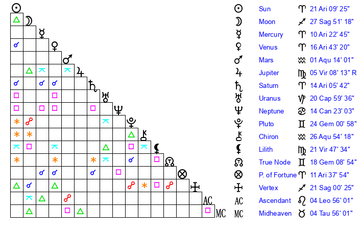 | Sun | 21 Aries 10 | 22 Aries 3 | 12 Leo 36 |