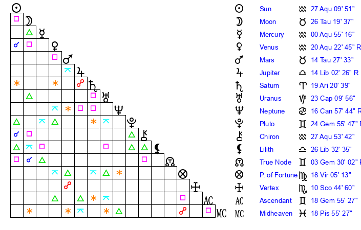 | Sun | 27 Aquarius 10 | 28 Aquarius 16 | 19 Gemini 52 |
