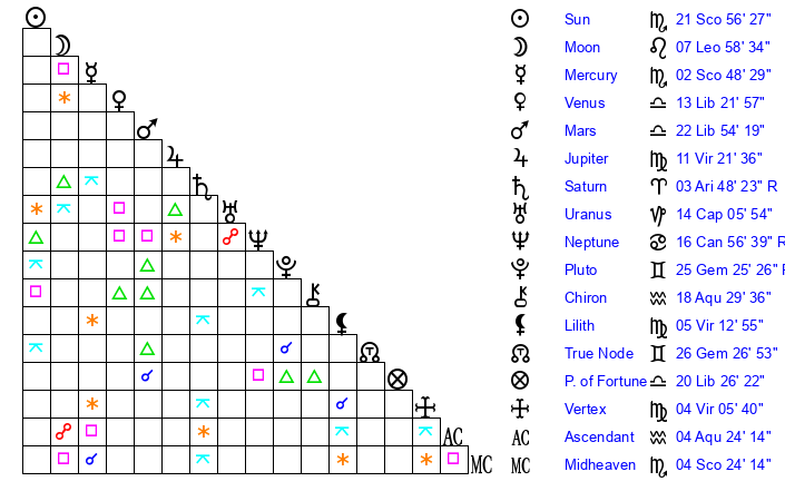 | Sun | 21 Scorpio 57 | 22 Scorpio 49 | 19 Pisces 30 |