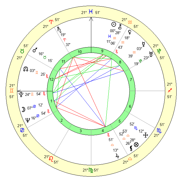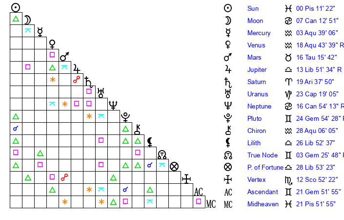 | Sun | 0 Pisces 11 | 1 Pisces 18 | 22 Gemini 44 |