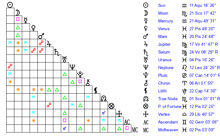 Neptune | 12 Leo 23 | 27 Pisces 57 | 11 Leo 6 |